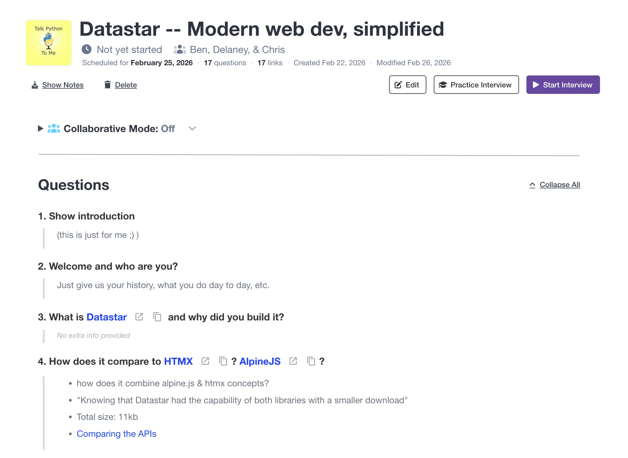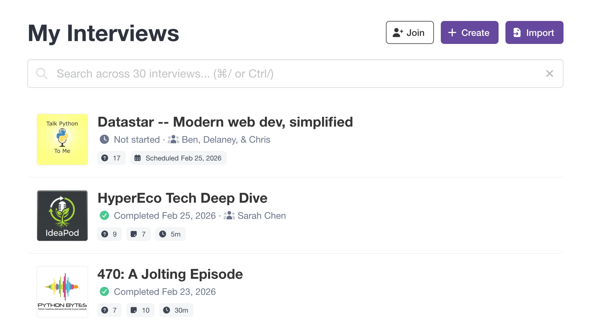 - 📋 Consistent metadata -- show-level hosts and branding carry through to your interviews
