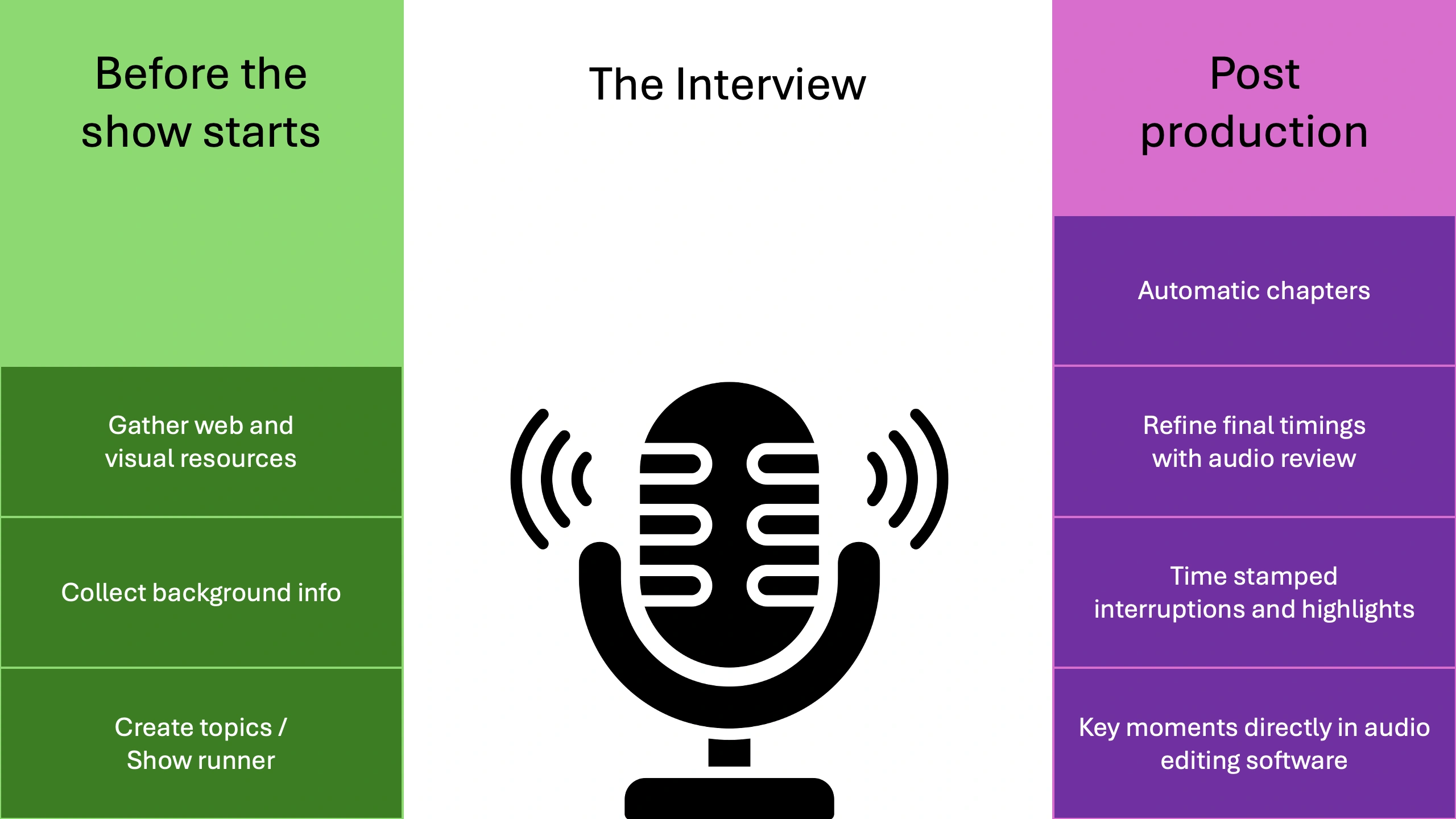 Great conversations happen when you're fully present. InterviewCue handles the details so you can focus on connection, curiosity, and creating memorable content. Then when the recording ends, your post-production work becomes faster, easier, and richer with automatically captured timestamps, events, and context that would otherwise buired in an hour of audio.