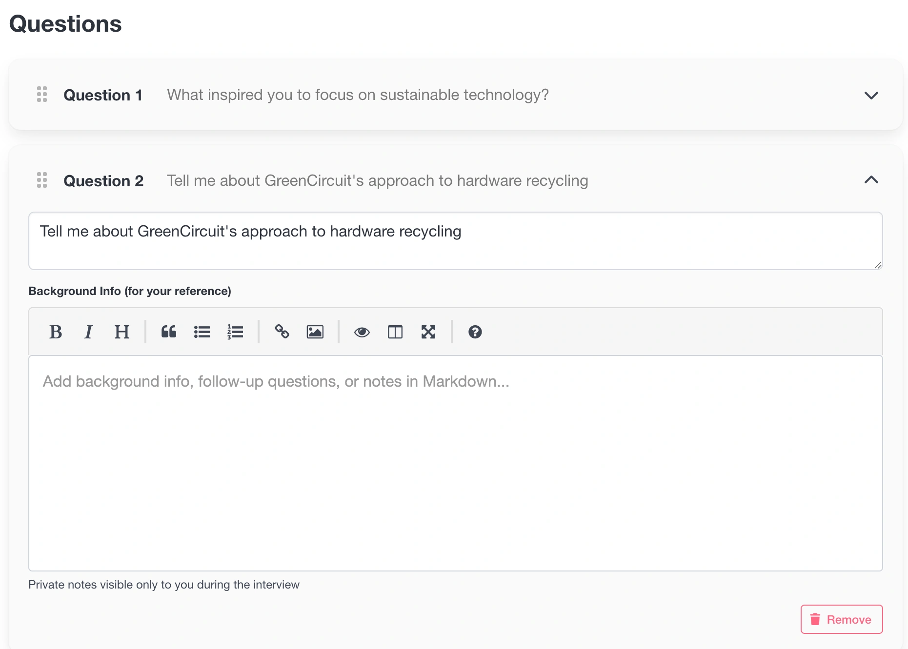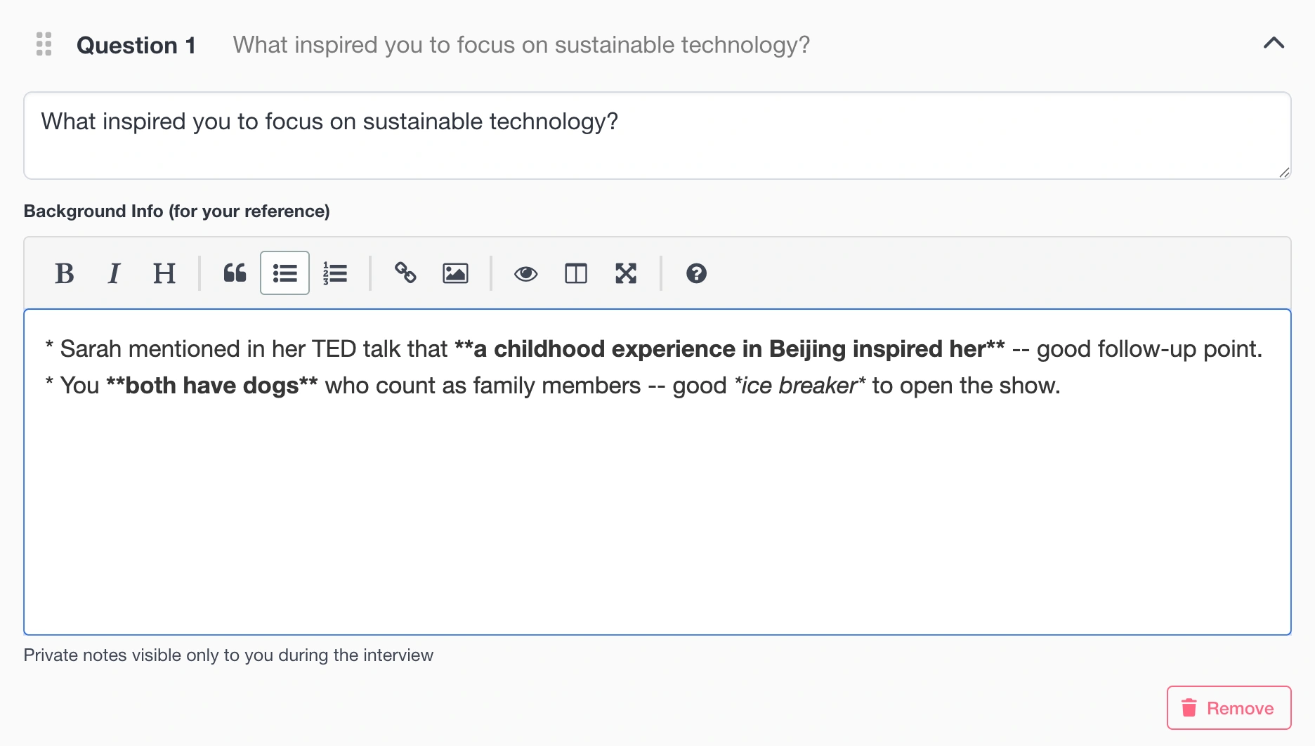 For each question, you add background notes that up you can keep private or share with the guest (guest collab mode). These keep you informed without overwhelming the interface during the interview: