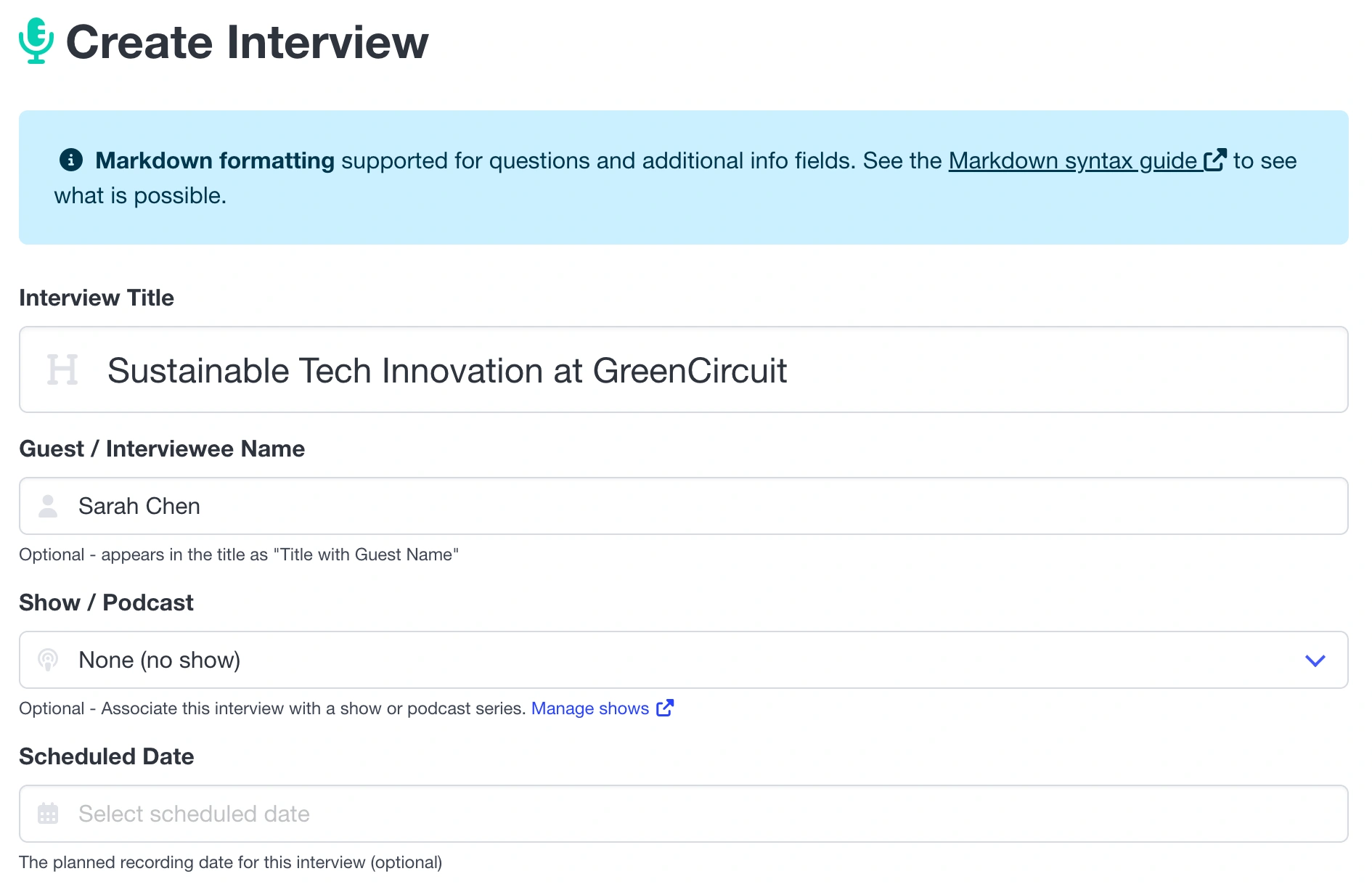 Optional: If this interview is part of a podcast series, you can select a Show from the dropdown. Shows help organize related interviews and maintain consistent branding. (Don't have a show yet? No problem—you can create one later or skip this step entirely.)